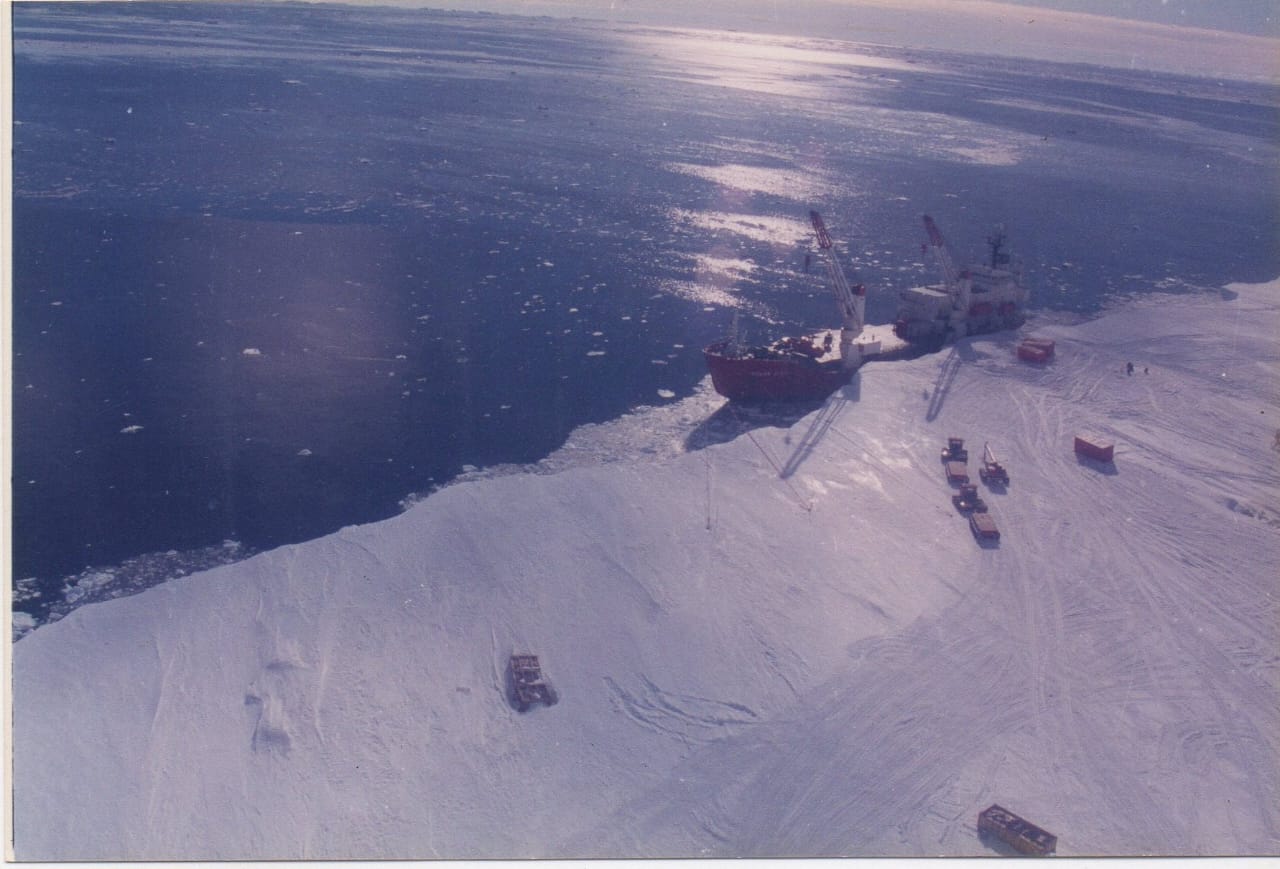 The ship anchored by massive shelf ice stretching kilometers into the ocean. India’s second station, Maitri, stood 125 km away – the first, Dakshin Gangotri, now buried under ice.