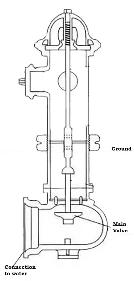 In areas subject to freezing temperatures like Canada, only a portion of the hydrant is above ground. The valve is located below the frost line (about 10 feet deep) and connected by a riser to the above-ground portion. A valve rod extends at the top of the hydrant, where it can be operated with the proper wrench. This design is known as a ‘dry barrel’ hydrant. In this model, the barrel, or vertical body of the hydrant, is normally dry. It is only in movies you see the fire hydrants spewing out water when hit by a car in a chase. It is unlikely to happen as the control valve and the water is at least 10 feet below and it would be difficult for any known car of the day to break the cast iron column.