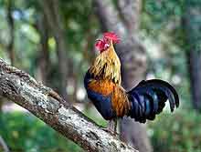 The rooster mates with the hens during the day, like all birds. The mating ritual will typically begin with a rooster exhibiting a type of dance meant to attract his mate. He would dip one wing, wave his colourful tail feathers and dance around the hen in a circular pattern. If the hen is receptive, she will crouch down and allow the rooster to mount her, else he would force himself upon her. For balance, he would peck on to her comb atop her head. The entire mating would last a few seconds.