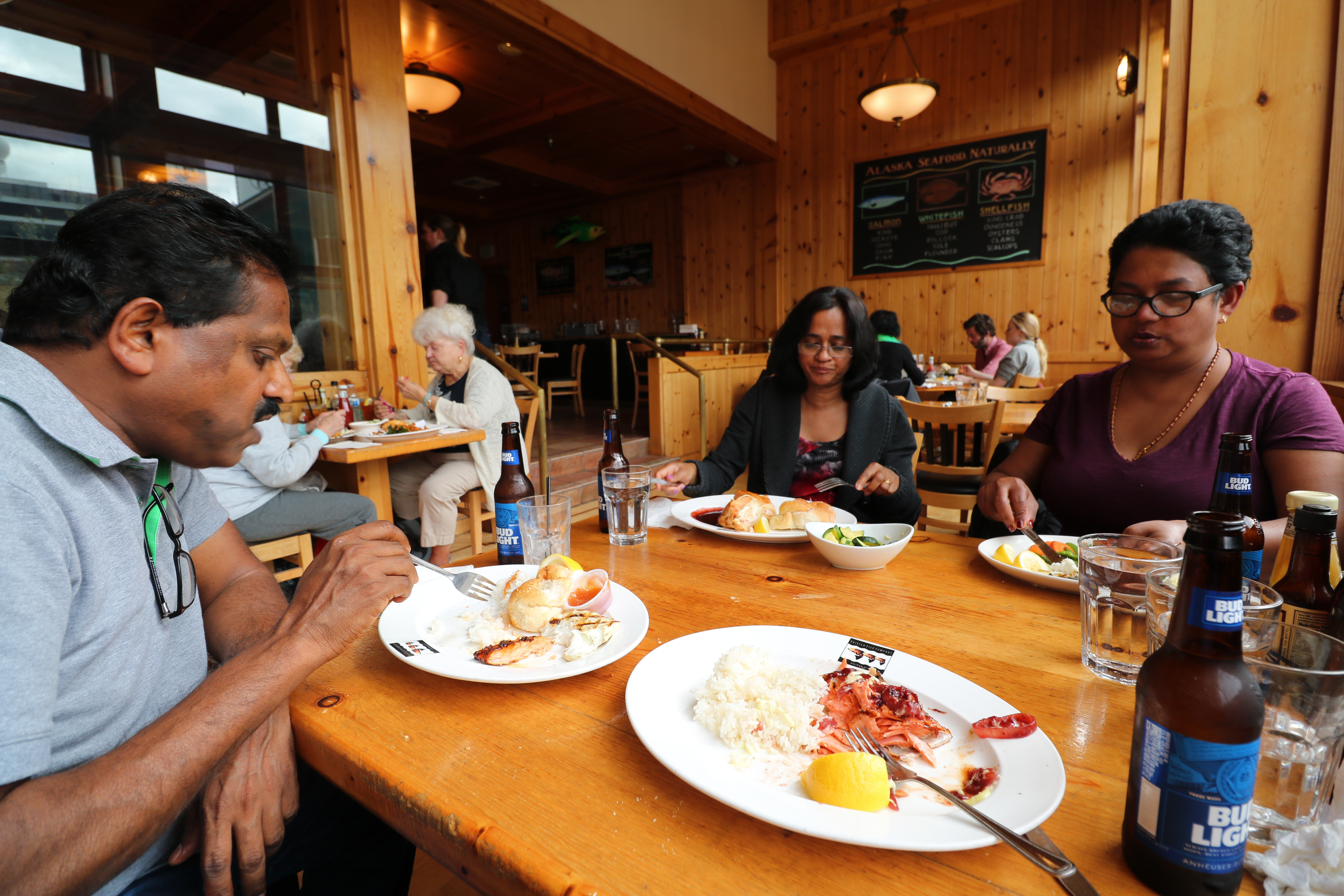 We came down on the tramway and decided to enjoy lunch at Juneau’s Twisted Fish Company, rather than going on board our ship anchored 100 meters away. This place was recommended to us by locals and it was worth it. We savoured a menu of salmon, halibut and clam, sourced straight from the docks.