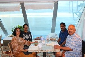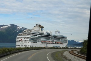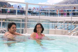 After a sumptuous lunch, we boarded the ship and we sat in the balcony enjoying the breeze and the view outside on the waterfront. There were many sea planes taking off and landing on water and a fishing boat crew were spreading their nets to catch salmon between the cruise ships and the ‘runway.’