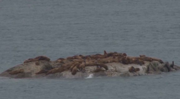 As we entered the Glacier Bay we first sighted the South Marble Island. This small island is a  sunbathing spot of gigantic Sea Lions. They lay on the rocks  with the dominant males sitting with their back arched and head erect.