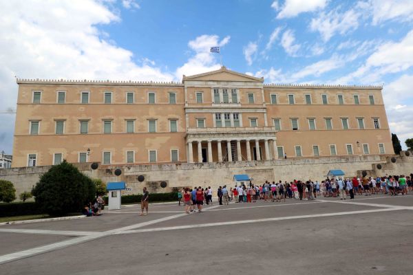 In front of the Parliament Building is the Tomb of the Unknown Soldier.  The monument, with a large relief depicting a nude, dying hoplite (citizen soldier of Ancient Greece, quite different from a professional soldiers), was inaugurated on March 25, 1932, on the Greek day of independence. On either side of the tomb are excerpts from Pericles’s famous funeral oration inscribed on the wall.