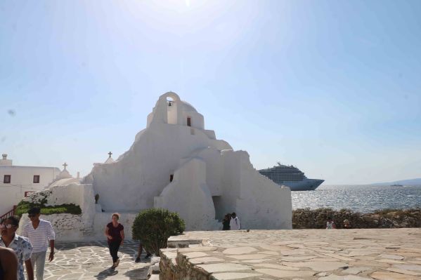 Surrounded by the boutiques and bars in Little Venice stands the flower-bedecked Church of Panagia Paraportiani (Our Lady of the Postern Gate). This church is a cluster of four whitewashed chapels, topped by a further bright white chapel on the upper storey, reached by an external staircase. Built between the Fourteenth and Seventeenth Centuries, the church once guarded the entrance to the town’s castle, long since destroyed.
