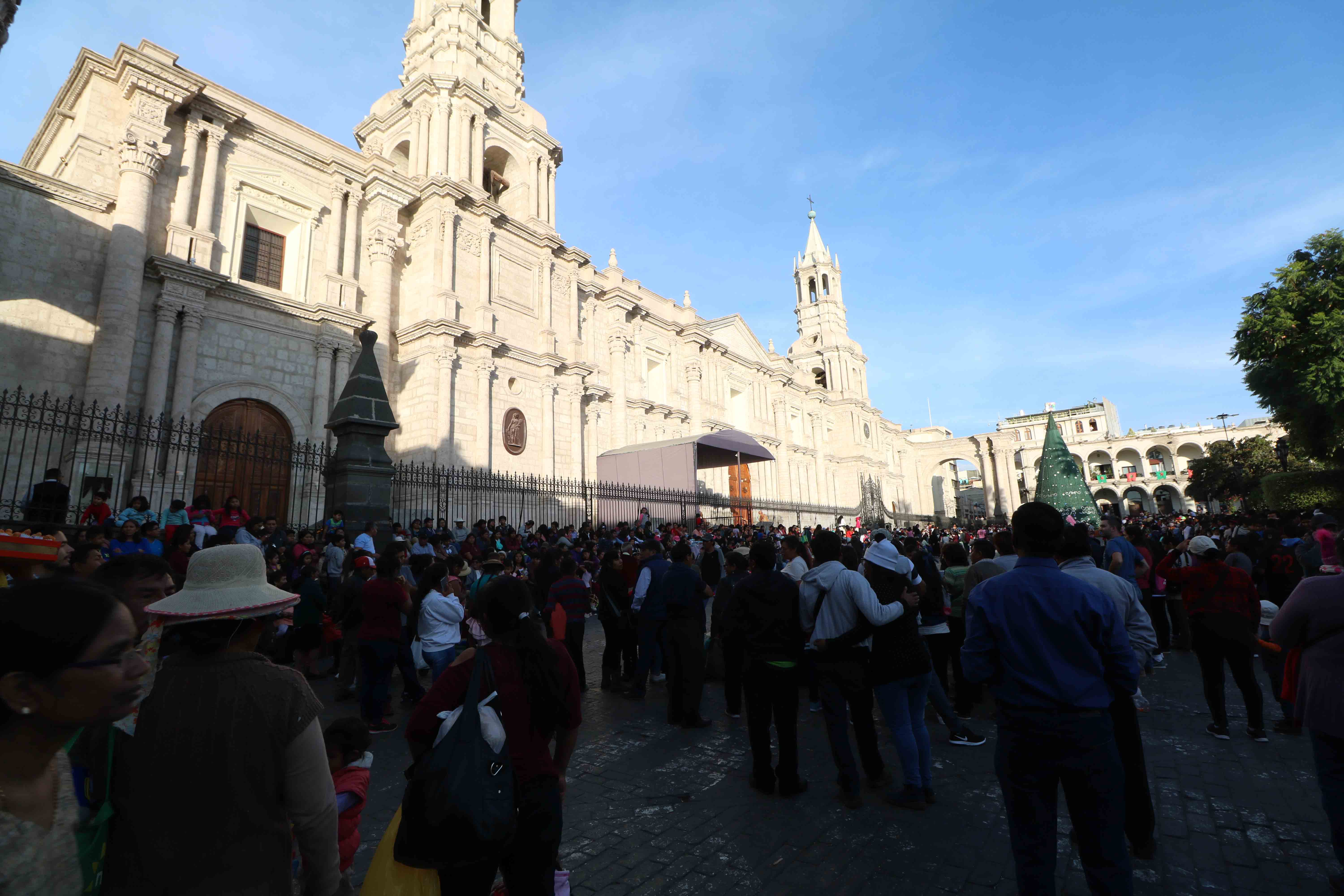 On the Northern side of the Square is the majestic Basilica Cathedral of Arequipa, the most important Catholic church of the city. Its construction started in 1540, the same year that the city of Arequipa was founded, built in ashlars (white volcanic stone) and brick vaults. Throughout its history the church was destroyed many times by fire, earthquakes and volcanic explosions, restored after each destruction, the latest in 2001.