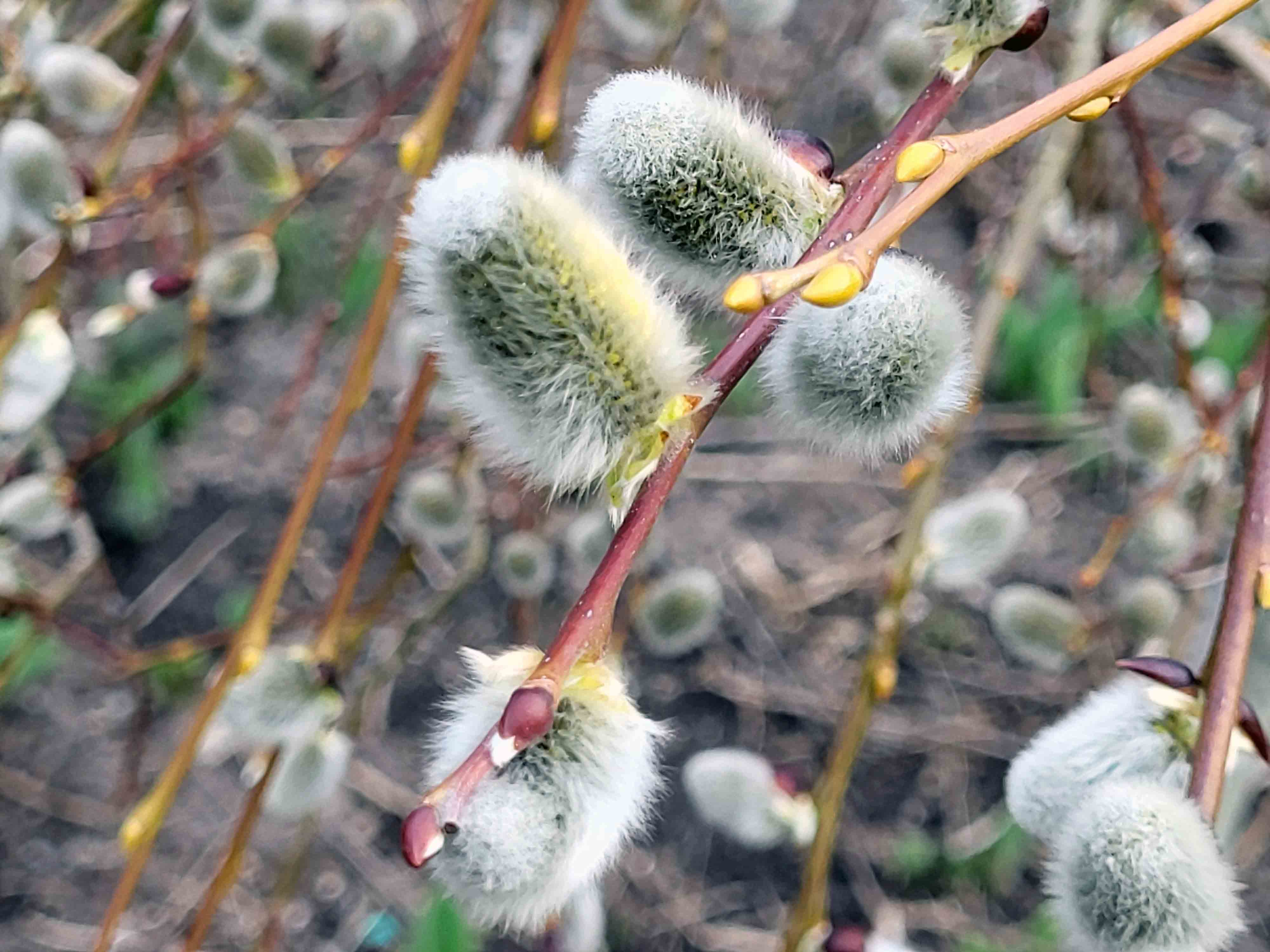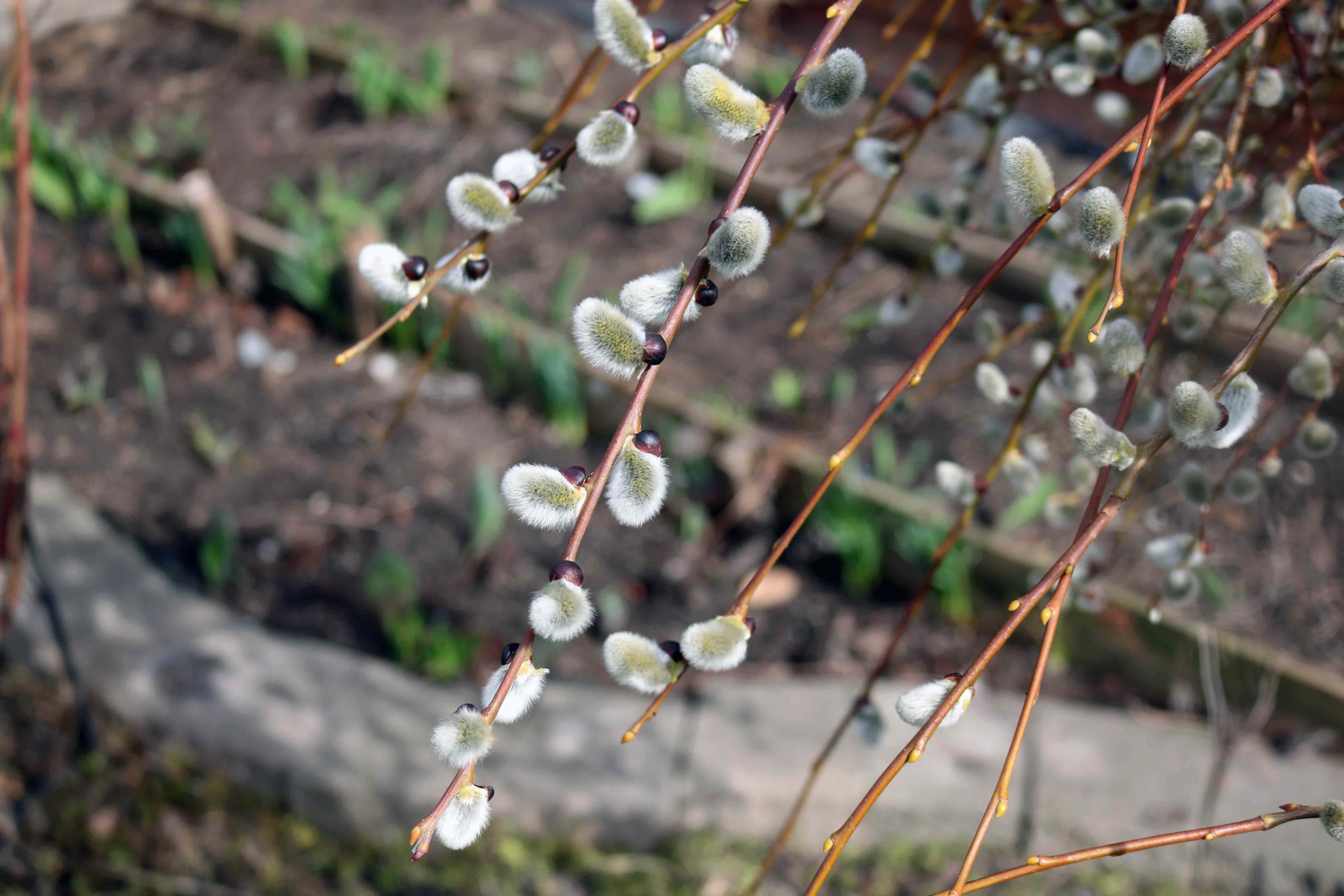 The very first flowers that appear in our garden on the onset of Spring is on the Weeping Pussy Willow. The Salix Caprea ‘Pendula’ is commonly known as the Goat Willow or Weeping Pussy Willow, which belongs to the Caprea genus of flowering trees.The tree grows pendulous branches and can reach up to 8 feet, while the spread of the tree can also be around 6 feet.Fuzzy nubs start to appear along the branches, even before the leaves sprout. The reason for this is so that the leaves don’t get in the way of the pollen travelling on the wind, so the chances of pollination are increased. These nubs are flowers that sprout just before they fully bloom. The soft coating of hairs acts as insulation to protect these early bloomers from cold temperatures. Most other willows make similar flowers, and since they’re among the very first to bloom, they’re especially delightful—they signal the onset of spring. The tree derives its name from these soft silver tufts that resemble a tiny cats’ paws, feeling so much like fur.Even in full bloom, willow flowers hardly look like flowers at all. They have neither any petals nor any fragrance. Such flowers are called Catkins, derived from old Dutch word Katteken meaning a kitten. Alder, Birch, Beech, Hazel also produce catkins. Pussy willows are Dioecious, meaning there are both male plants and female plants. Only male plants produce the fuzzy flowers. The flowers on female plants look more like greenish hairy caterpillars. The male catkins begin to look yellow when the pollens develop on the tips of the anthers.Catkins usually don’t rely on pollinators to spread their pollen. Instead, they release it into the wind, where it may or may not land on the female flower parts. To hit their targets, the catkins produce a a large volume of pollen. Such massive quantity of pollens released in the atmosphere results in many humans developing allergies and breathing difficulties during this period.