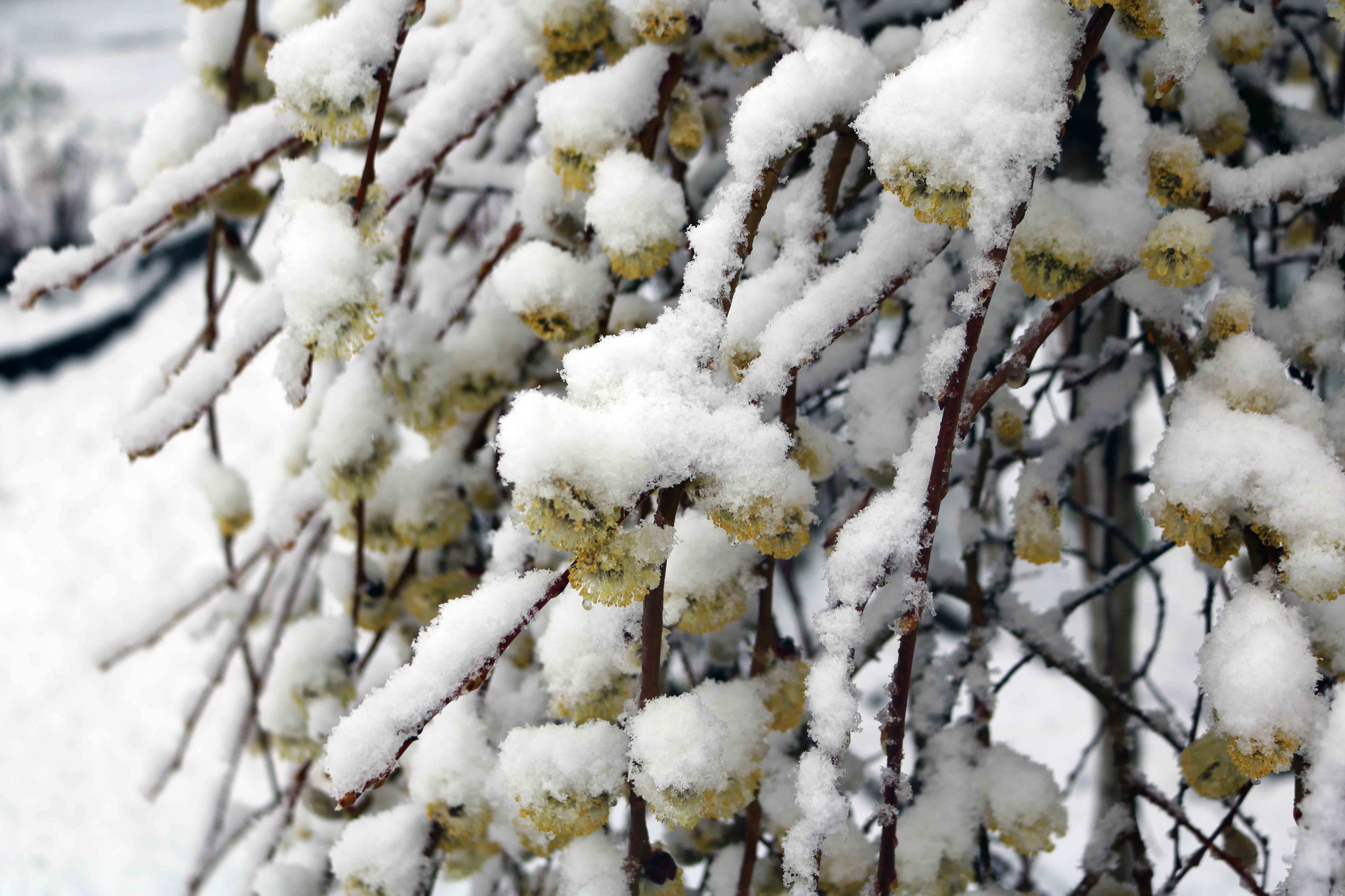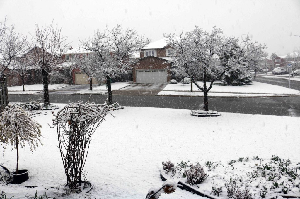 Easter Monday, April18, 2022, 4 PM – we were in for a surprise – Snowfall after the onset of Spring with the Spring Equinox on 20 Mar 2022. This date marks the astronomical first day of spring around the Northern Hemisphere. In the Northern Hemisphere, March equinox (Spring Equinox or Vernal Equinox) is when the Sun crosses the Equator, heading North. This is Utttarayana as per Hindu Astronomy. After this date, the Northern Hemisphere is tilted more toward the Sun, resulting in increasing daylight hours and warming temperatures. Environment and Climate Change Canada (ECCC) dutifully announced the arrival of Spring on March 20 and I obediently put away the snow-blower and the snow shovels in the shed. The weather is expected to be warmer during the final days of April, but a cooler pattern is expected for early May.The snowfall predicted was for about eight inches, what came down may be a bit more. Blame it on Climate Change or Global Warming!It appears that Mother Nature too was tricked by the weather. Daffodils have already sprouted and grown over eight inches tall. They will all thrive through this Spring-Snow-Storm and will flower in a fortnight.It is a Canadian saying that ‘April rains bring in May flowers.’ Tulips in our garden are also getting buried under the snow. What will April snow bring this May?The Weeping Pussy Willow catkins flowered, and they will lose their pollens with the snow piling on them. Some of the flowers in the inside will survive this onslaught of snow. A tricky storm track and a delicate temperature gradient hovering around 2oC resulted in this unprecedented spring snowfall. During this time of the year, the difference between a snowfall and a chilling rain is only a few degrees Celsius.