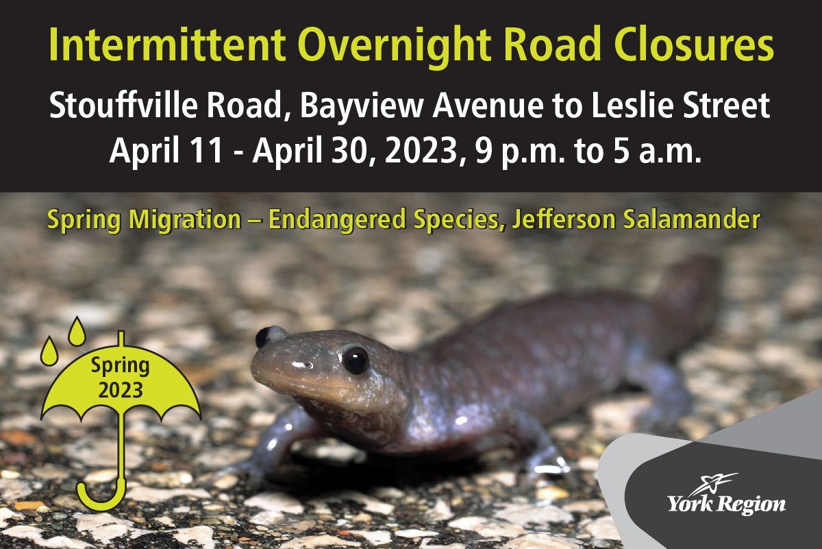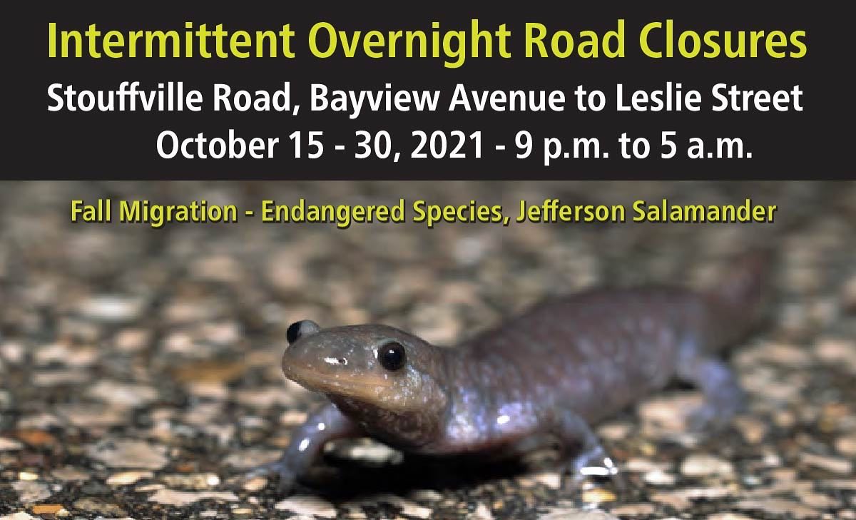 During October, the Jefferson Salamanders, an endangered species, scuttle across the Stouffville Road as they migrate from their summer breeding grounds to return to their winter habitat in the deciduous forest. A section of Stouffville Road is in the Oak Ridges, which has many of the features the Jefferson salamander requires, including undisturbed natural forests, rocky outcrops, wetlands and ponds. As the temperature drops, they make their way across the road, to their winter habitat in the deciduous forest to survive the cold. Most Jefferson Salamanders relocate on rainy nights.