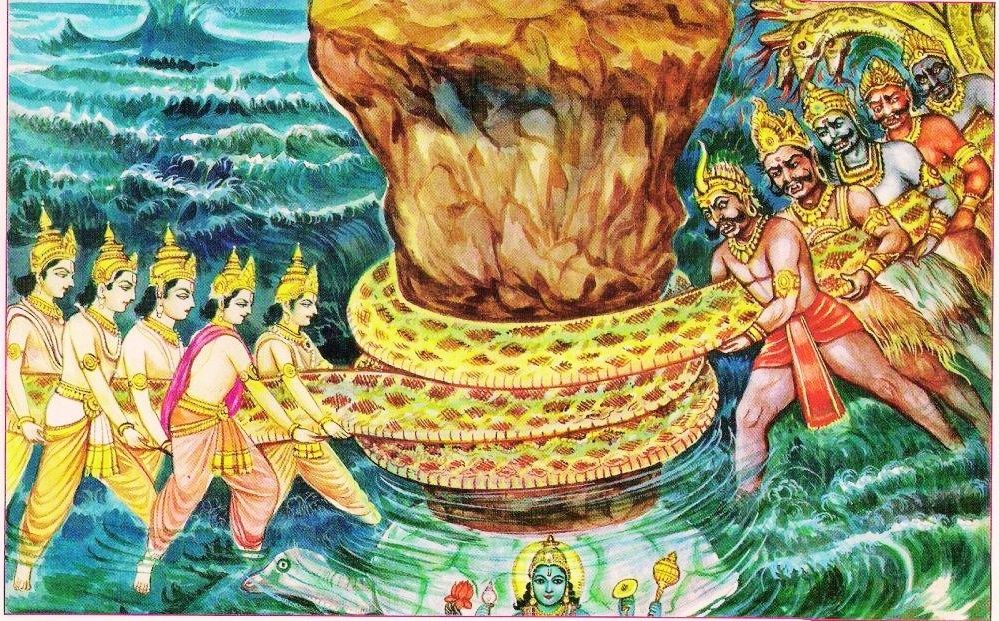The story of eclipses in Hindu mythology dates to the Samudra Manthan (churning pf the ocean,) as described in both Bhagawat and Vishnu Puranas. After the Amrit or elixir of immortality was churned out of the ocean, the Devas (Gods) used the Apsara Mohini to trick the Asuras (Demons) out of its share. One of the Asuras, Svarbhanu, disguised himself as a Deva, and sat between the Sun and the Moon for a drink of the elixir.