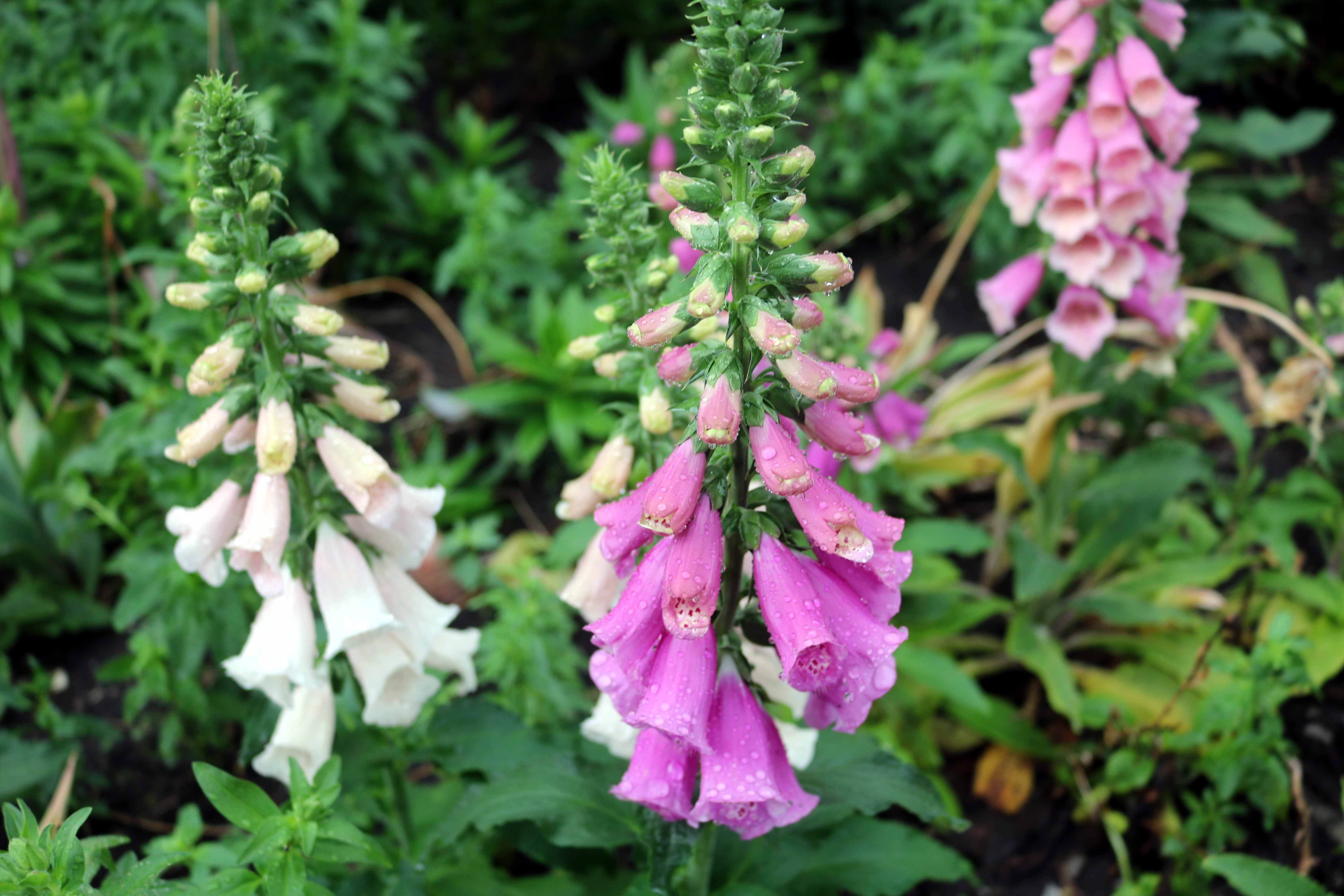 Foxgloves are eye-catching tall, slender flowering plants with flowers in clusters of tubular shaped blooms in colors of white, lavender, yellow, pink, red, and purple.