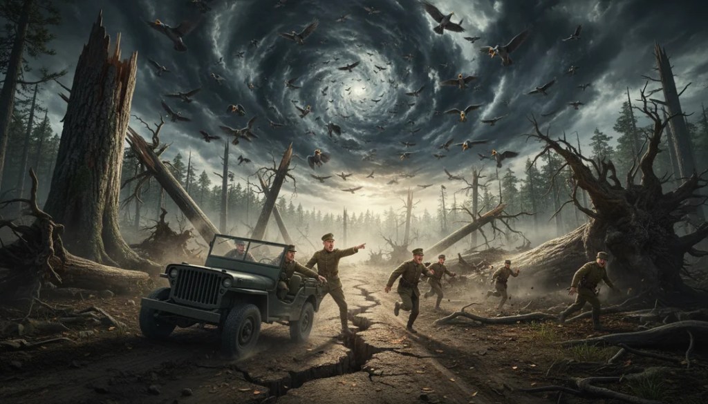 He jammed on the brakes, the tyres skidding as the very track beneath us began to ripple like a carpet being shaken. We scrambled out, and the sensory assault became a nightmare. The forest wasn’t just moving; it was screaming. Thousands of birds took flight in a panicked, black cloud, their shrieks creating a deafening, discordant cacophony. Then came the sound of the giants falling – massive, deeply rooted trees snapped like matchsticks, hitting the ground with bone-jarring thuds that competed with the underground growl of the shifting tectonic plates.