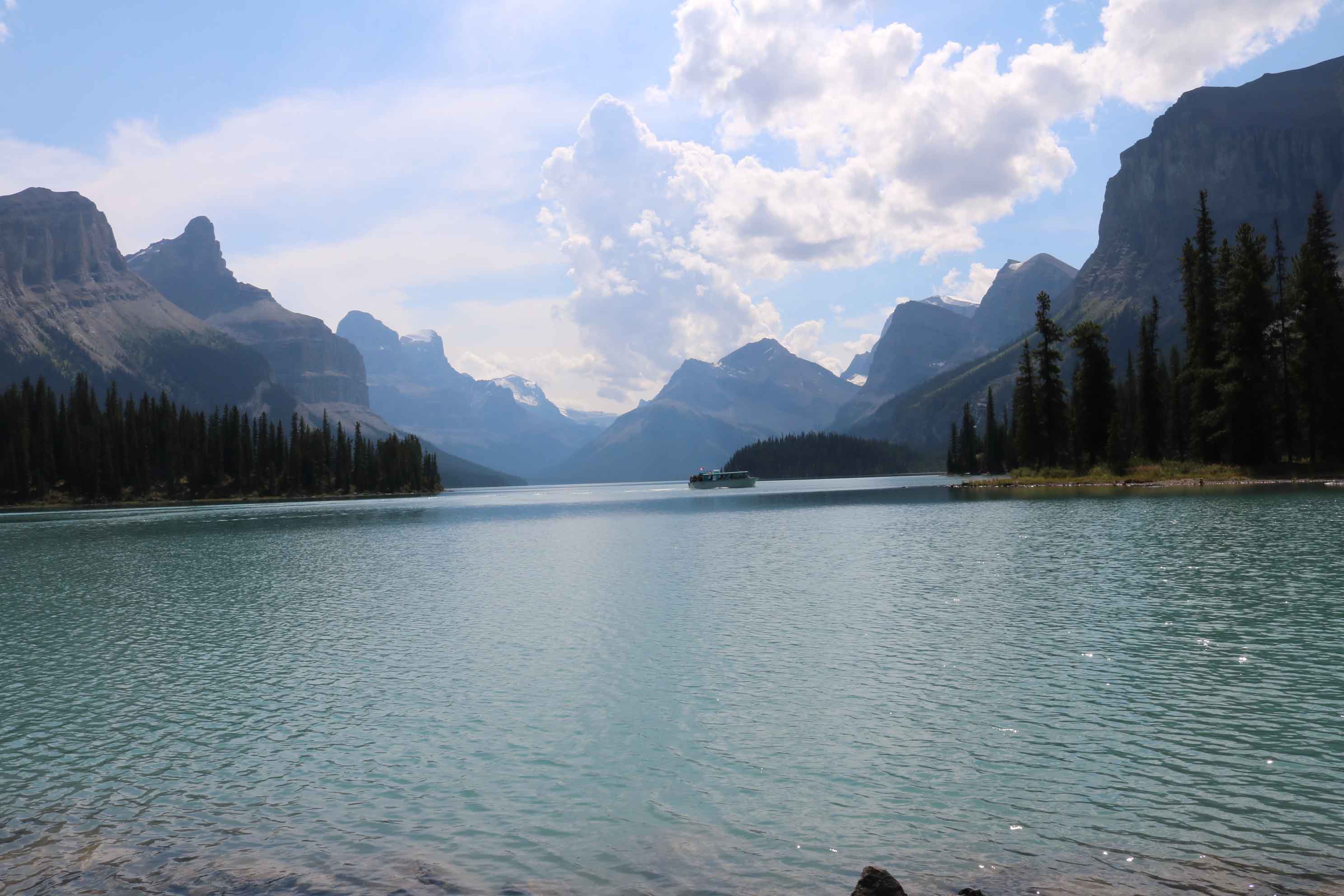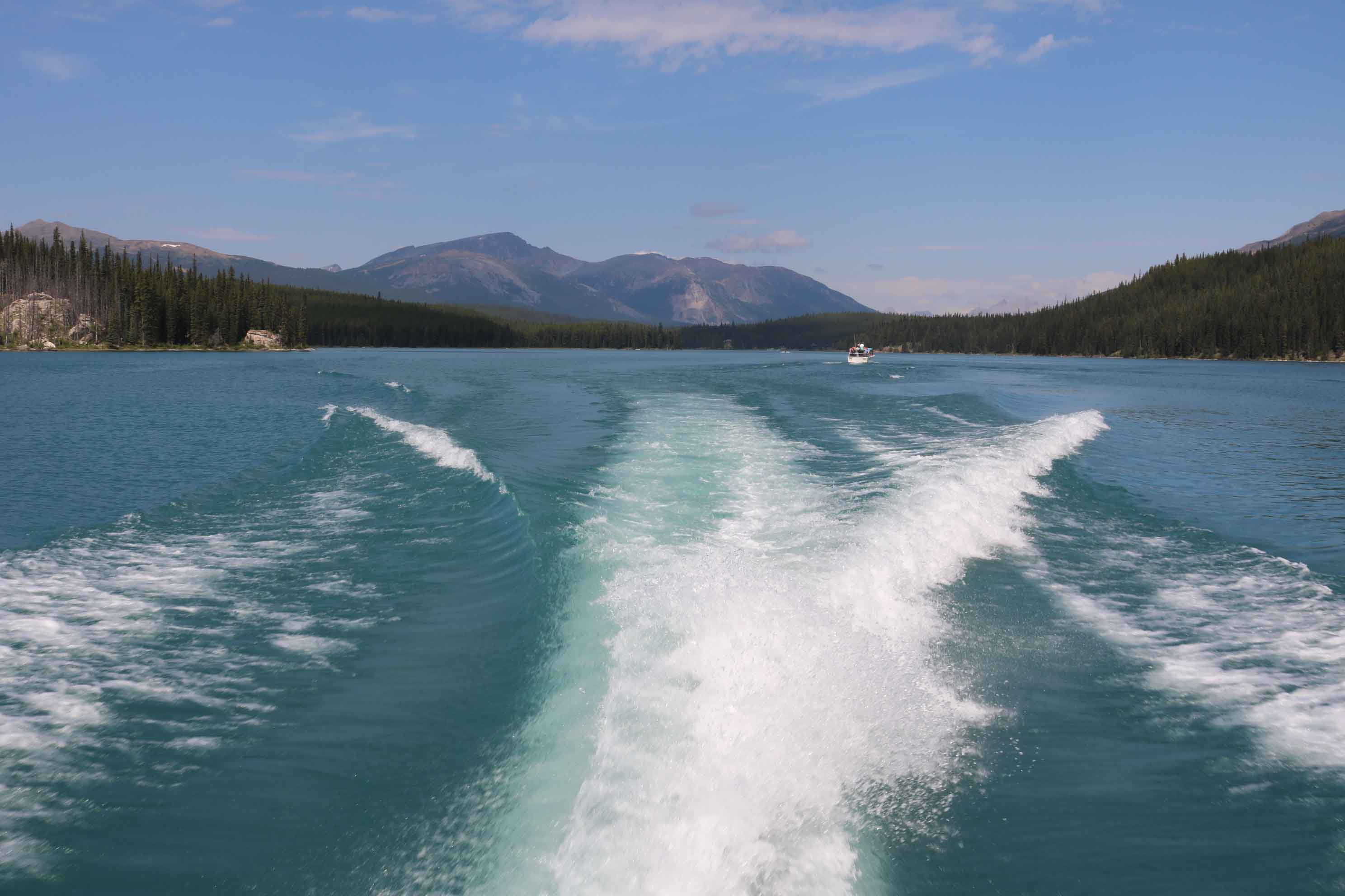 ‘Out through the bottom’ like a bathtub without a plug. The Maligne River pours into the lake from the South and the lake waters drain out through sinkholes in the bottom. The water then streams through a cave system formed in the slightly soluble limestone rock, surfacing again in the area of Maligne Canyon 16 km downstream. This is one of the largest known sinking lakes in the Western Hemisphere and may be the largest inaccessible cave system anywhere in the world.